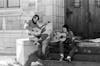 Gary Ricks, BS '78 (banjo) and Roger Hedge, BS '78 (guitar), playing music on the entrance steps of ...