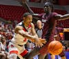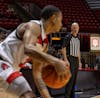 Senior guard Juwan Maxey dibbles the ball as the referee watches. In the 2024-25 season Maxey played ...