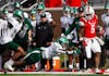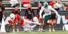 Redshirt Senior quarterback Kiael Kelly gets tackled by Eastern Michigan football players Nov. 15 at ...