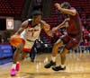 Freshman forward Jai Anthoni Bearden dribbles the ball down the court to the hoop as senior guard Johnathan ...