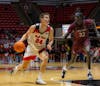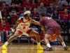 Freshman forward Mason Jones brings the ball down the court and looks for the hop as graduate student ...