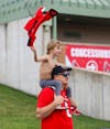 Ball State fan and his father cheering on Ball State against Eastern Michigan Nov 15 at Schuemann Stadium. ...