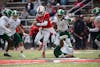 Eastern Michigan sophomore Joshua Long gets tackled by a Ball State football player Nov. 15 at Scheumann ...