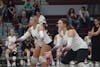 Seniors Ansley Draper, 4, and KyLynn New, 1, prepare to receive a serve from the Eagles. Both seniors ...