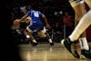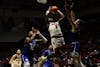 Sophomore guard Davion Hill shoots a layup Feb. 11 at Worthen Arena. Hill scored 14 points for the Ball ...