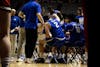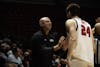 Ball State Men’s Basketball team Head Coach Michael Lewis coaches sophomore forward Kayden Fish on ...