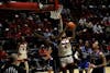 Sophomore forward Kayden Fish goes up for a layup Feb. 11 at Worthen Arena. Fish had a 50% field goal ...