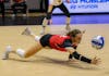 Sophomore libero Sophie Ledbetter dives for the ball Oct. 10 at Worthen Arena. Anna Evilsizor, DN