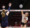 Junior Middle hitter Gwen Crull and graduate opposite hitter Noelle Vanoort give each other highfives ...