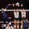 Graduate opposite hitter Christyn Ashby and junior middle hitter Gwen Crull block the ball as Toledo ...