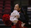 Ball State cheerleader cheers as the Women's Ball State begins to start Oct. 10 at Worthen Arena. Anna ...