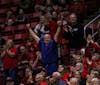 Ball State women's volleyball fan celebrates as they win the set Oct. 10 at Worthen Arena. Anna Evilsizor, ...