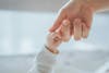 Close-up little hand of child baby holding hand of mother, A newborn holds on to mom's, dad's finger, ...