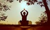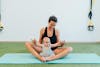Young mother practicing yoga with her baby sitting between her legs, on a yoga mat