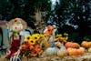 Girl Scarecrow, pumpkins, sunflowers on bales of hay for a hayride on the bed of an old rustic antique ...