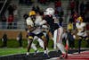 Freshman tight end Kameron Anthony celebrates his game winning touchdown with his teammate Dejaun Echoles ...