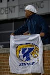 A Kent State fan waves a flag after a touch down Nov. 5 at Scheumann Stadium during a Ball State vs. ...