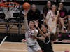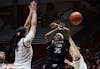 Freshman Alba Caballero blocks senior guard Leilani Guion Feb. 7 at Worthen Arena. Caballero had 4 rebounds ...