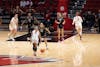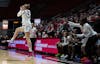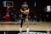 Freshman Zhen Verburgt receiving pass Feb. 7 at Worthen Arena. Verburgt had 26 minutes played against ...