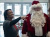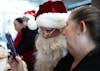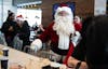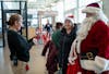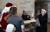 A staff worker with Ball State University Dining shows someone dressed up as Santa Claus someone on ...