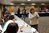 Philena Evett, chief administrator of the Student Government Association (SGA), explains something to ...