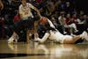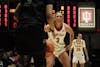 Ball State senior guard Bree Salenbien and Ohio junior guard Asiah Baxter fight for the ball Feb. 28 ...