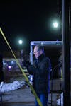 Ball State President Geoffrey Mearns warms up after addressing the City of Muncie on stage at Light ...