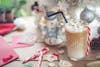 Festive drink. Merry Christmas with signature iced cinnamon coffee drink. candy canes and ginger breads ...