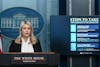 White House Press Secretary Karoline Leavitt speaks alongside a screen displaying information for US ...